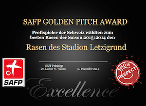 Den SAFP GOLDEN PICHT AWARD für die Saison 2013/2014 hat in der Super League das Stadion Letzigrund gewonnen. Dies ist umso bemerkenswerter als dass im Stadion Letzigrund am meisten Super League Spiele stattfinden, weil ja der FC Zürich und Grasshopper das Stadion gemeinsam nutzen. Diese Leistung verdient grossen Respekt und soll anderen Stadien als Vorbild dienen.
