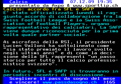 Die Profispielervereinigung Swiss Association of Football Players SAFP und die Swiss Football League SFL haben am 11. November 2009 eine Grundsatzvereinbarung abgeschlossen.