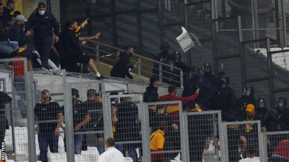 An on-field clash between the home side’s on-loan Arsenal defender William Saliba and Galatasaray forward Mbaye Diagne also saw objects thrown on to the pitch during stoppage time as both players were separated by team-mates before they received bookings.