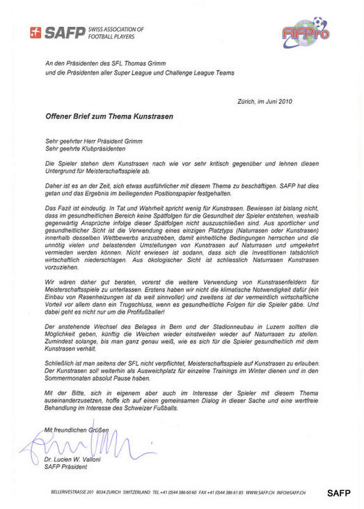 Die Spielervereinigung setzt sich deshalb klar für die Bevorzugung von Naturrasen in Meisterschaftsspielen der Super League und Challenge League ein und ersucht die Klubs wie auch die SFL die Sicht der Spieler gebührend zu berücksichtigen und den Trend zu Kunstrasen einstweilen zu stoppen.”